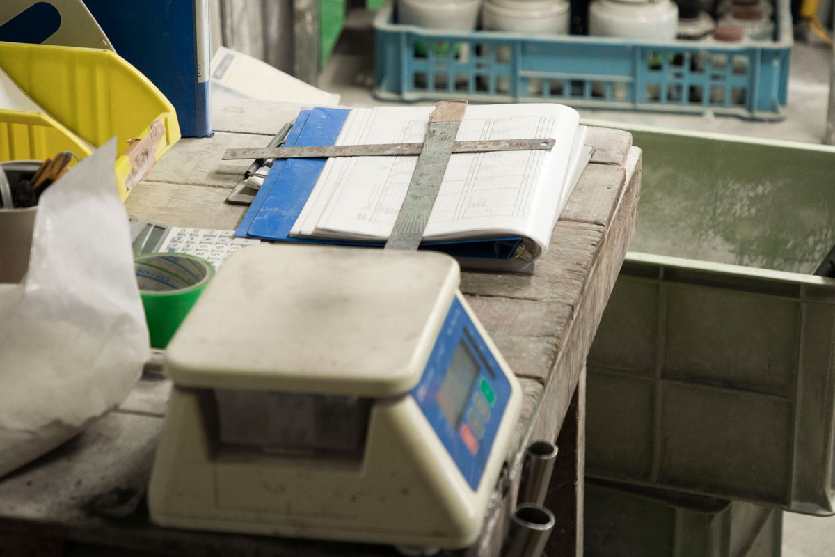 釉薬に関わる業務全般を担当しています。具体的には、釉薬の発注・作成・在庫管理、不具合が発生した際の原因究明や改善策の検討を行っています。さらに、新しい釉薬の調合や試作にも携わっており、製品の質感や発色を理想に近づけるための試行錯誤を重ねています。施釉ロボットのプログラム作成や、製造ラインでのトラブル対応といった技術面の業務にも関わり、現場全体の品質向上に取り組んでいます。